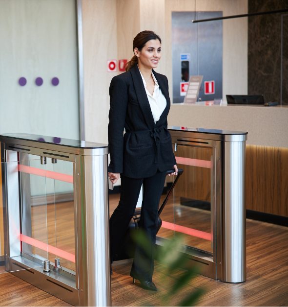 Swing barrier gates manage and control pedestrian access, ensuring only authorized individuals can enter or exit specific areas. The barriers consist of one or two arms that swing open to allow passage when access is granted.